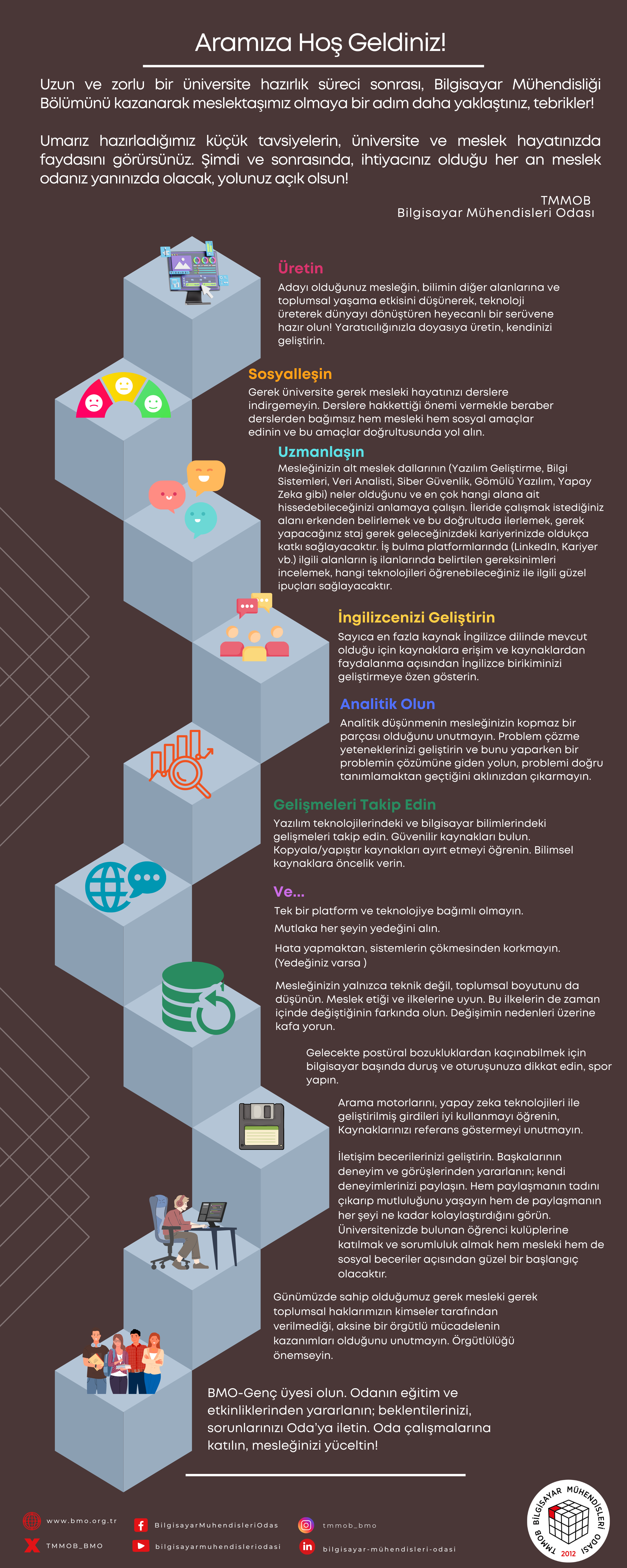 Uzun ve zorlu bir üniversite hazırlık süreci sonrası, bilgisayar mühendisliği bölümünü kazanarak meslektaşımız olmaya bir adım daha yaklaştınız, tebrikler! Umarız hazırladığımız küçük tavsiyelerin, üniversite ve meslek hayatınızda faydasını görürsünüz.