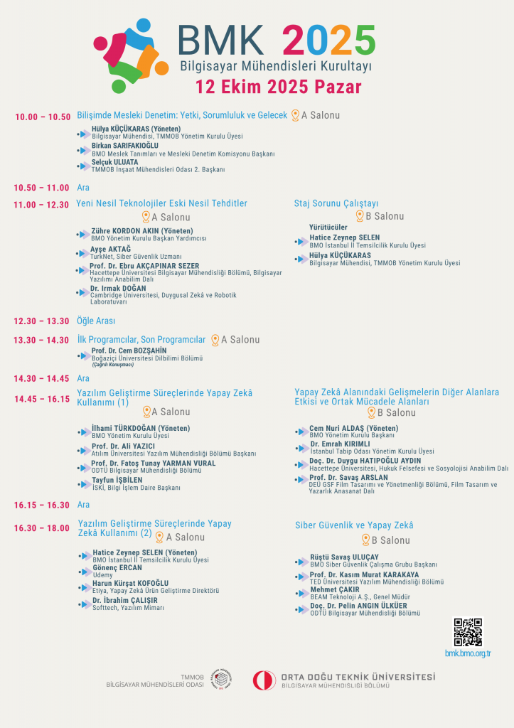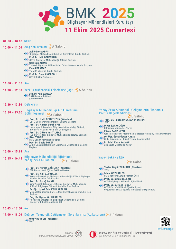 Beşinci kez düzenleyeceğimiz Bilgisayar Mühendisleri Kurultayı (BMK), Orta Doğu Teknik Üniversitesi ev sahipliğinde gerçekleştirilecek. ODTÜ Bilgisayar Mühendisliği Bölümü işbirliğiyle düzenleyeceğimiz Kurultayımız, 11-12 Ekim 2025 Cumartesi- Pazar günlerinde ODTÜ Kültür ve Kongre Merkezinde yapılacak.