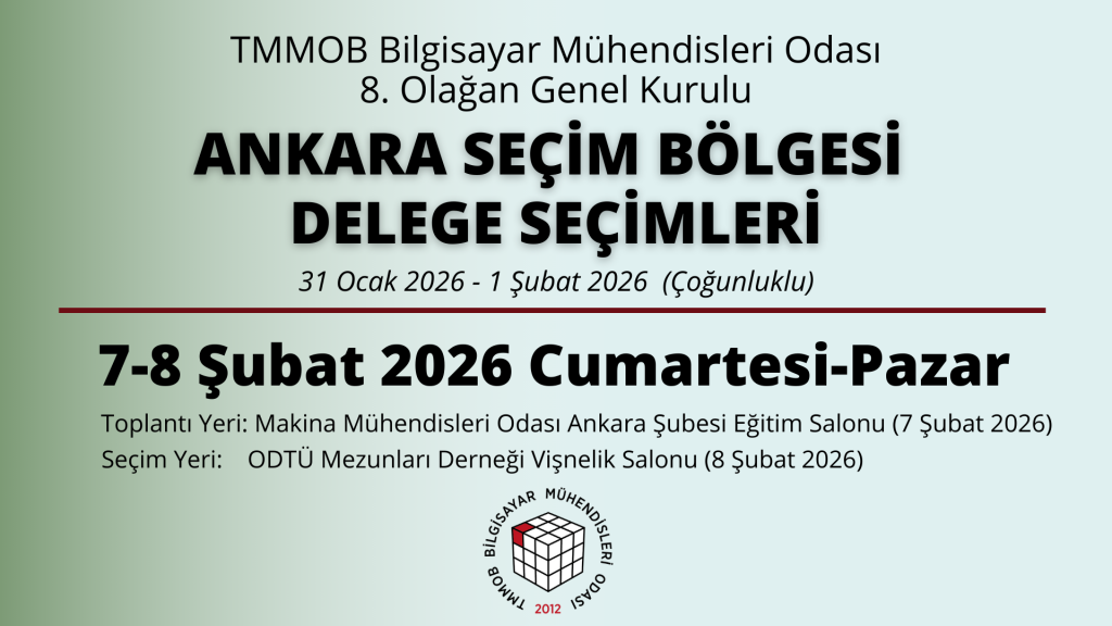 Mart 2026 sonunda gerçekleştirilecek Bilgisayar Mühendisleri Odası 8. Olağan Genel Kuruluna katılacak Ankara Seçim Bölgesi delegelerini belirlemek amacıyla 31 Ocak 2026-1 Şubat 2026 Cumartesi-Pazar günleri aşağıdaki gündemle “BMO Genel Merkezi Necatibey Cad. No. 88/7 Kızılay-ANKARA” adresinde delege seçimleri yapılacaktır.