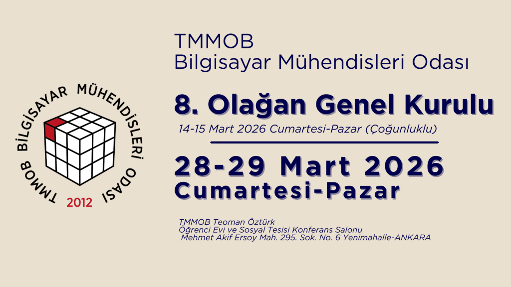 TMMOB Bilgisayar Mühendisleri Odası 8. Olağan Genel Kurulu, 14 Mart 2026 Cumartesi günü saat 10.00’da “BMO Genel Merkezi, Necatibey Cad. No. 88/7 Kızılay-ANKARA” adresinde aşağıdaki gündemle toplanacak, seçimler 15 Mart 2026 Pazar günü 09.00-17.00 saatleri arasında aynı adreste yapılacaktır.