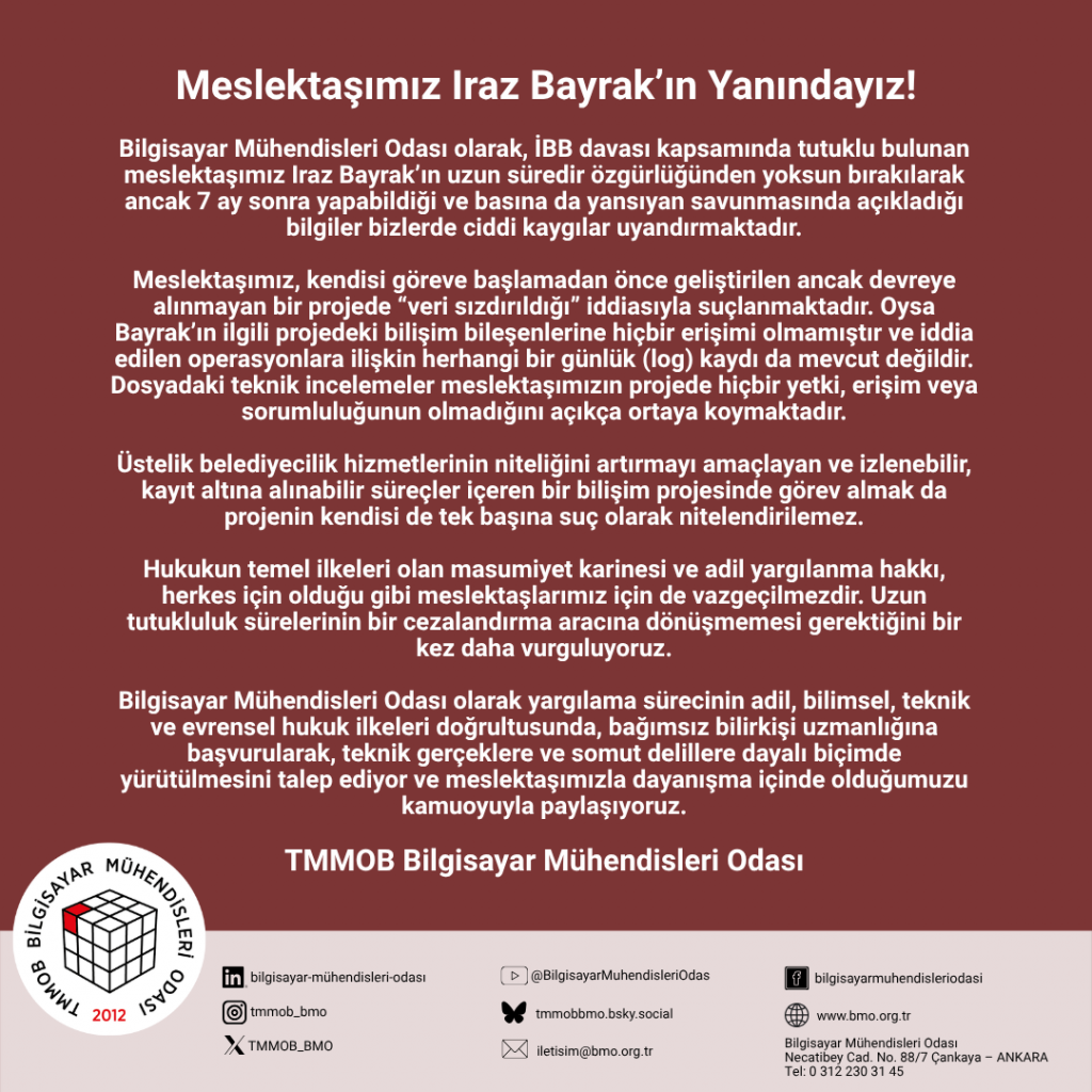 Bilgisayar Mühendisleri Odası olarak, İBB davası kapsamında tutuklu bulunan meslektaşımız Iraz Bayrak’ın uzun süredir özgürlüğünden yoksun bırakılarak ancak 7 ay sonra yapabildiği ve basına da yansıyan savunmasında açıkladığı bilgiler bizlerde ciddi kaygılar uyandırmaktadır.